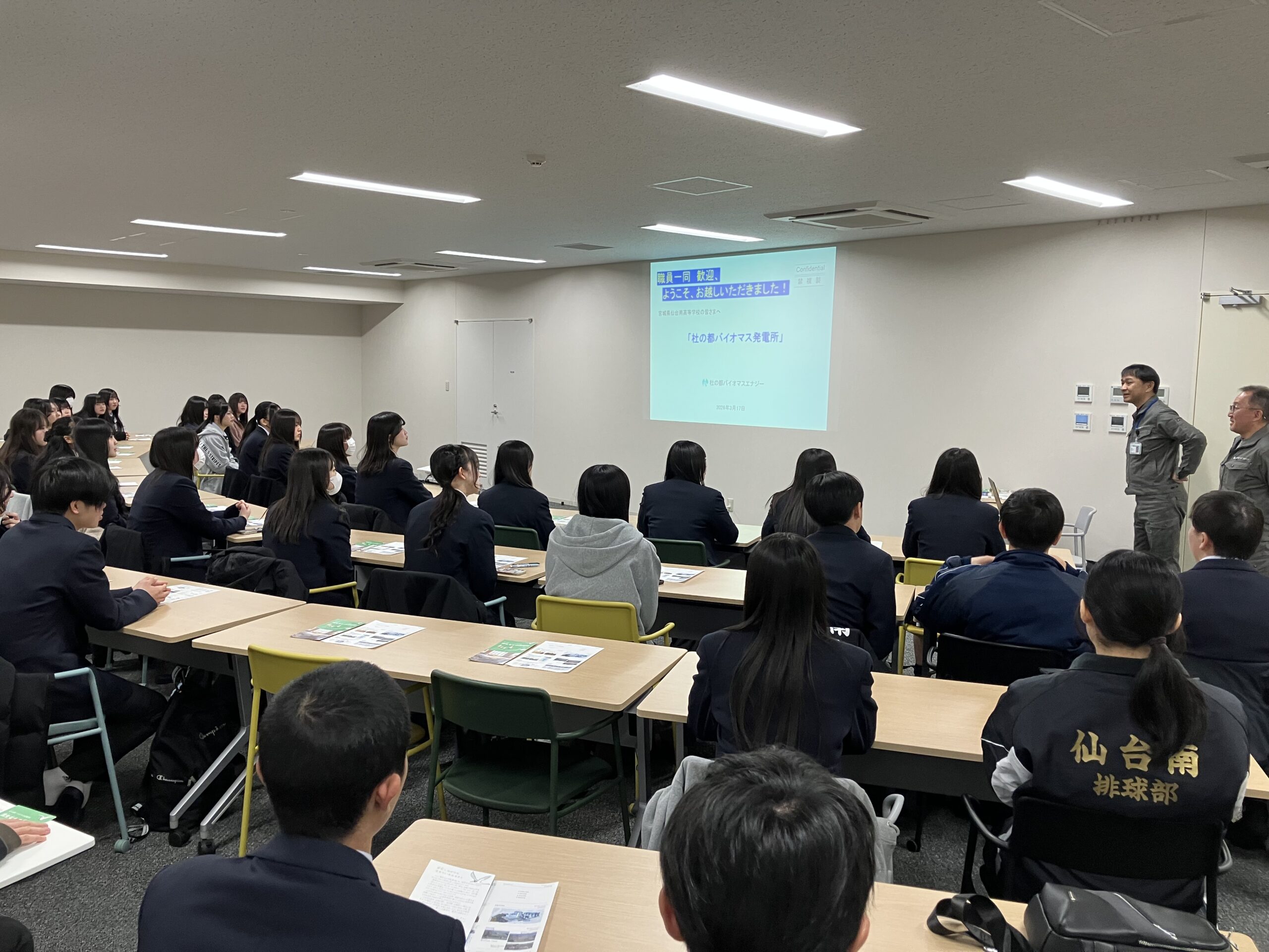 先日、宮城県仙台南高等学校の生徒さん約100名が、杜の都バイオマス発電所へ見学に来てくれました。